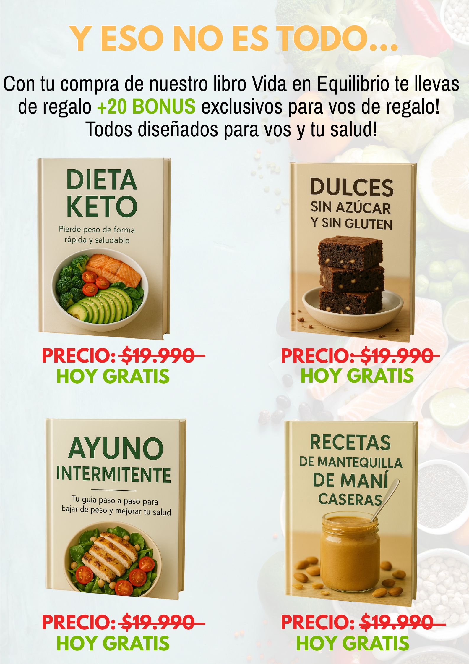 Con la compra de VIDA EN EQUILIBRIO te llevás 20 BONUS EXCLUSIVOS de regalo. Después, el cupo pasa al siguiente interesado.